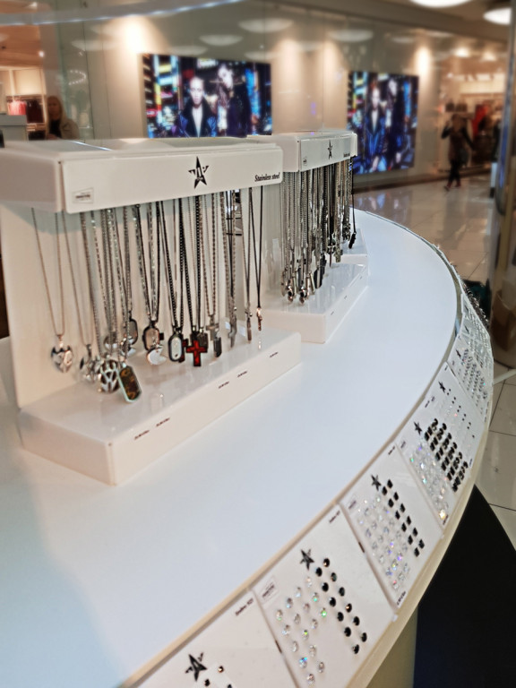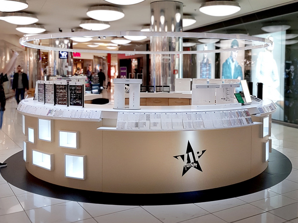 Preureditev prodajnega pulta za prodajno mesto VIP Fashion v BTC City Park-u. Izdelava pleksi stojal, lestenca, obnova in postavitev pulta (barvanje, nalepke, police in vitrine z LED osvetlitvijo) ter samolepilne talne nalepke.